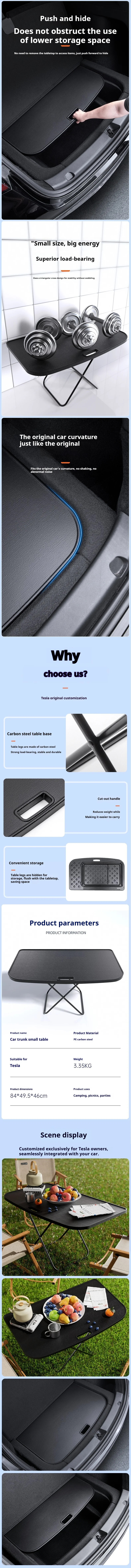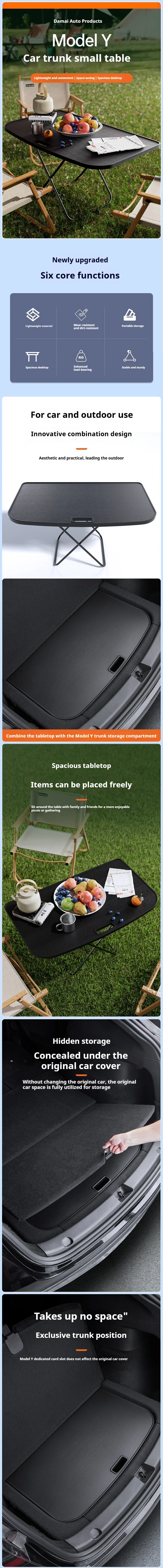 for Tesla Model Y, with a small table in the trunk, a folding table at the rear of the car, and camping equipment