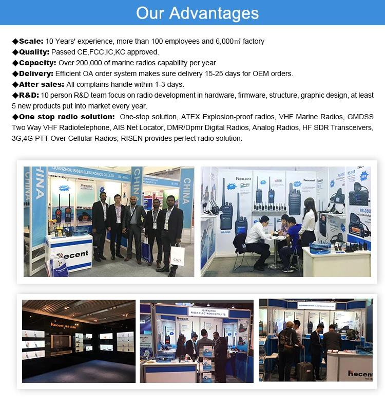 Located in Quanzhou City,Fujian Province,Quanzhou Risen Electronics Co.,Ltd is a top manufacturer and exporter who has more than 10 years experience,The company has gathered a group of talents both in R&D,manufacturing and in marketing of ATEX Explosion-proof radios,VHF Marine Radios,GMDSS Two Way VHF Radiotelephone,AlS Net Locator,DMR/Dpmr Digital Radios,Analog Radios,HF SDR Transceivers,3G,4G PTT Over Cellular Radios.RISEN dedicates itself to providing "Great Radio Solutions"to consumers worldwide. RISEN has confidence to serve worldwide partner better from: Production Base:Acreage:6,000 square meters, including:Manufacturing base,R&D Centre,Samples showroom Core Equipment:AIS detector,GPS tester,Ultrasound,Glue machine,Spot welding,Capacitance meter,Waterproof tester,High and low temperature mac hine,Soldering station,Spectrum Analyzer,Frequency Scanner,Flash Block,Oscilloscope,Digital Comprehensive Tester,Attenuator,Multimeter,Power Supply,Automatic dispenser etc.; Production Capability:Over 200,000 of marine radios capability per year.Most of the raw materials of our products have been tested strictly according to standards. OEM:We are the OEM supplier for many brands worldwide.Mould Developing:R&D Centre is responsible for all mould development,we can meet our consumer's new design image. Limited warranty:12 months(calculated from the exporting date from RISEN)for all radio items. Complaint:We have a set of smooth operation process for the customer complaints.We will solve it in as far as possible when we get the picture,problem description,series number for the item and order number for complaints. In our promised limited warranty date,spare parts free,we will charge you parts cost if the complaint item out our limited warranty date. Quanzhou Risen Electronics wishes to bring consumers a higher level of reliable and impressive radio experiences through its continuous improvement in performance.Dealers who value brand name and long-term cooperation are most welcome for a close cooperation,which will definitely lead to continuous improvements on the quality of consumers'radio experience worldwide.