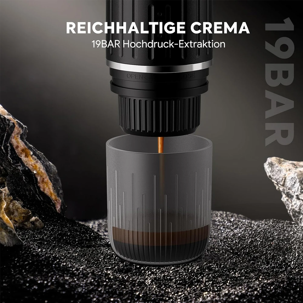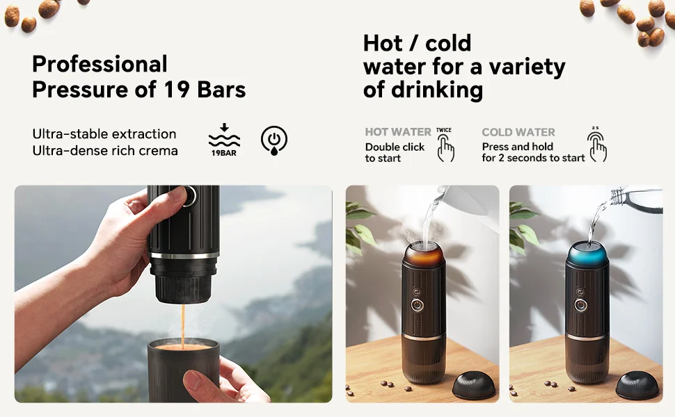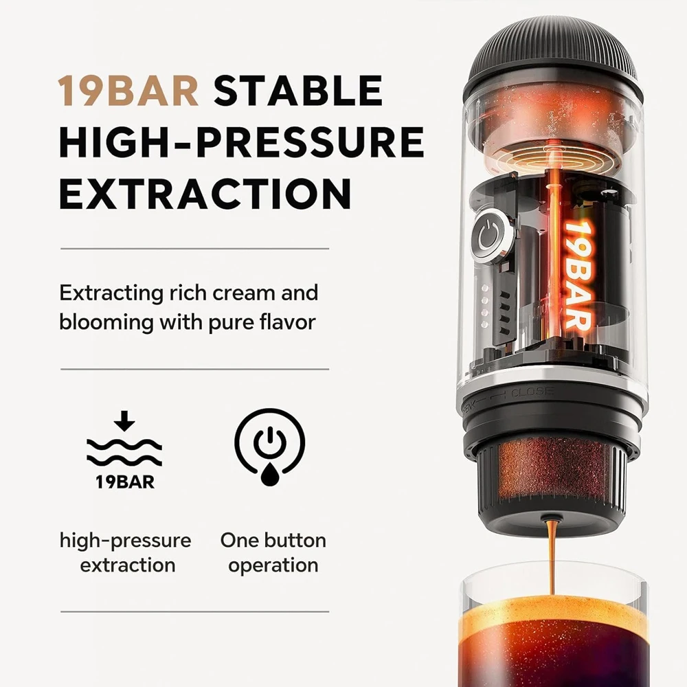 【FAST SELF-HEATING & RICH CREMA】: Heats 1.7oz of 77°F room temperature water to 198°F within 200 seconds. 19-bar pressure ensures a smooth extraction with rich crema comparable to results from professional desktop coffee machines!
