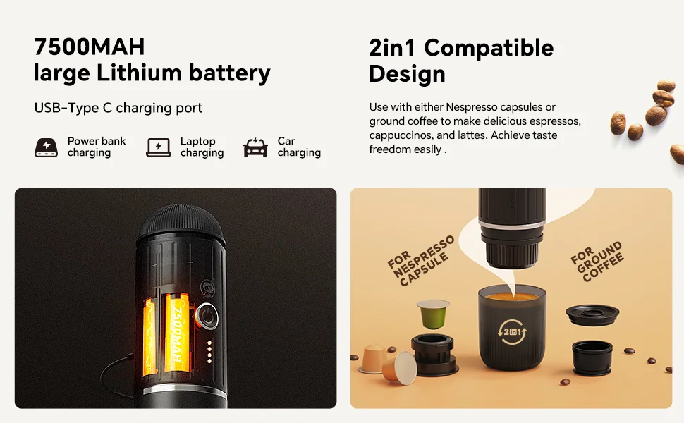 【PREMIUM BATTERY CAPACITY 】: Travel espresso maker comes with 7500mAh battery, compatible with 10-15 watts USB-C car chargers for universal charging, which supports up to 5 hot shots with 1.7oz 77°F room temperature water or 200+ shots with hot water.