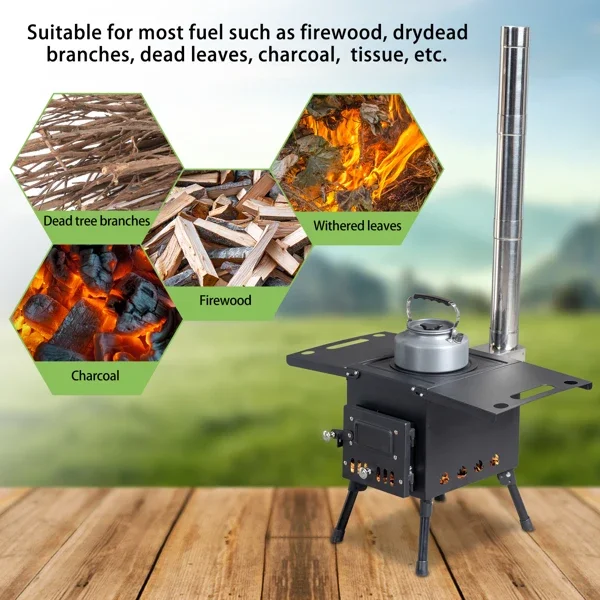 Portable Wood Stove.The folding racks on both sides increase the functionality of easy portability, 17.6lbs. The side frame can be used as a portable. The foldable legs can be folded flat under the stove. The chimney tube can be easily stored in the furnace for easy transportation and storage. The hook that comes with the wood stove makes it easy to clean the ashes at the bottom. Provide more convenience for your camping/hunting trip.